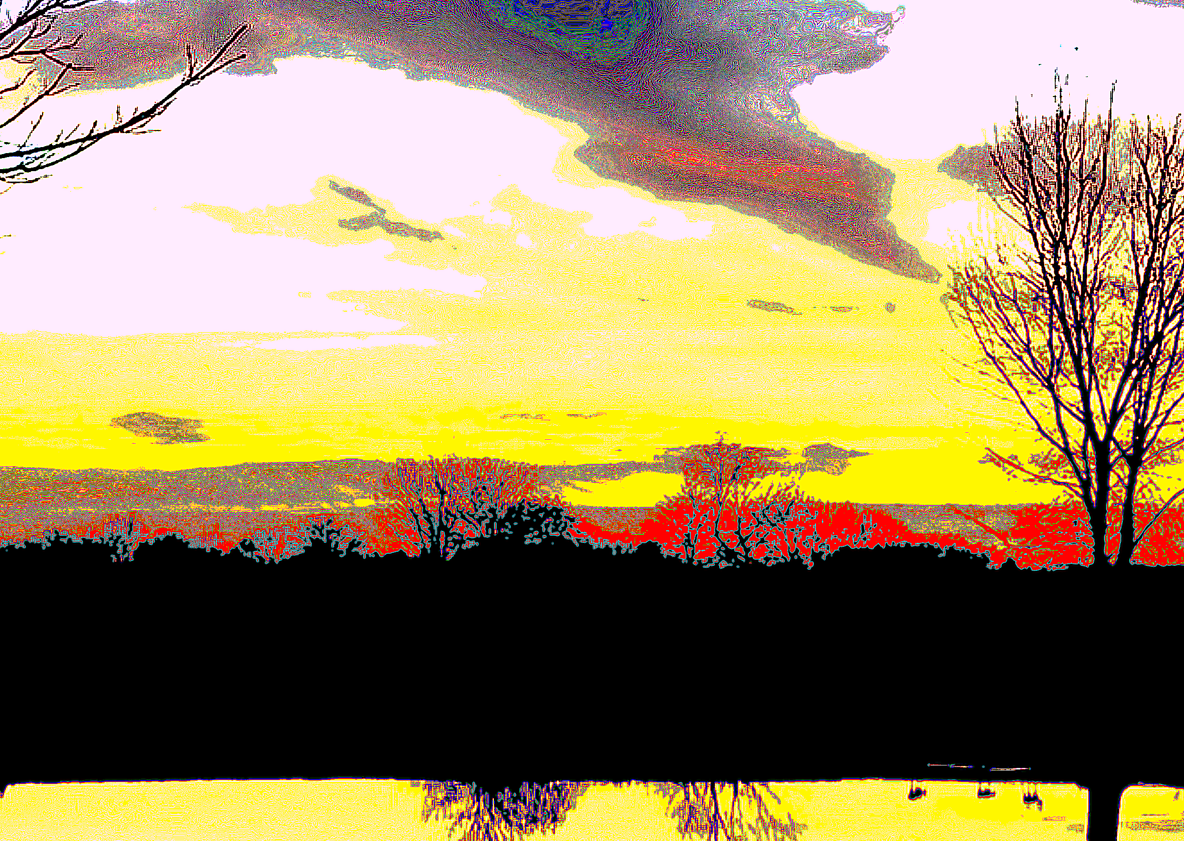 Four deer walk from the left to the right of the frame. It is sunset, and the deer are reflected in the still surface of a pond, along with the colorful sky.